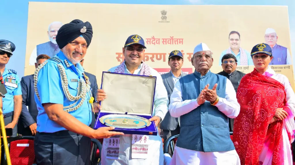 इस अवसर पर उप मुख्यमंत्री दिया कुमारी, मुख्य सचिव वी. श्रीनिवास, पुलिस महानिदेशक राजीव कुमार शर्मा, दक्षिण पश्चिमी वायु कमान के एयर ऑफिसर कमांडिंग-इन-चीफ एयर मार्शल तेजिंदर सिंह और सप्तशक्ति कमान के सेना कमांडर लेफ्टिनेंट जनरल मनजिंदर सिंह सहित कई जनप्रतिनिधि, अधिकारी और बड़ी संख्या में आमजन उपस्थित रहे।